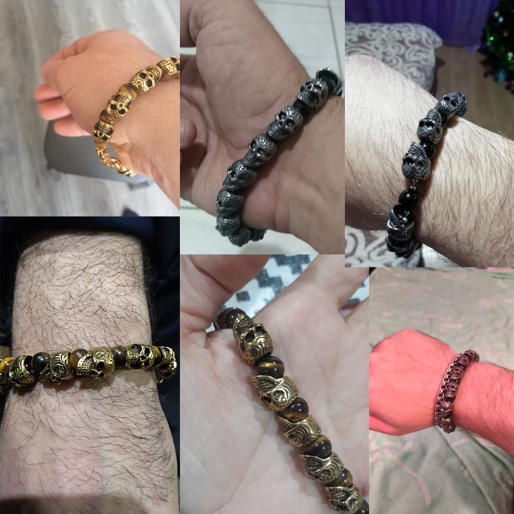 Mens Genuine Tiger Eye Gold Plated Stainless Steel Skull Beaded Bracelet-BUNNYKACHU