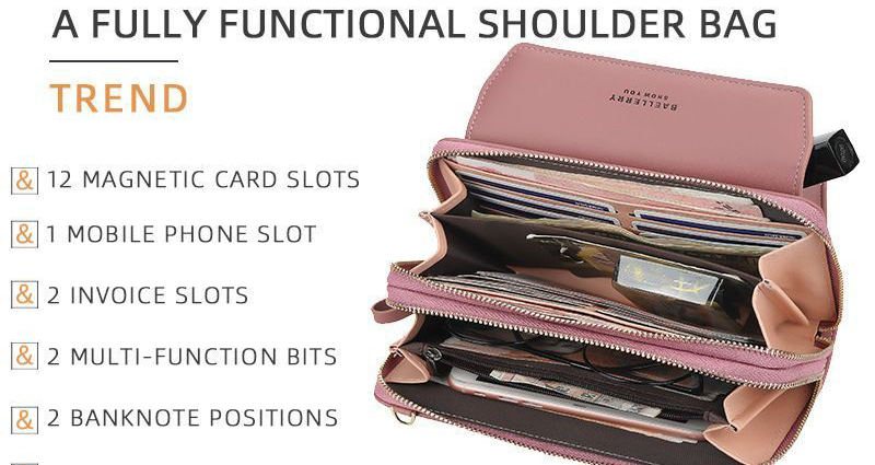 2 zippered main pocket, 12 credit card slots, 2 full-length bill compartment, large space, enough to store your lipstick, phone, cash, coins, etc.