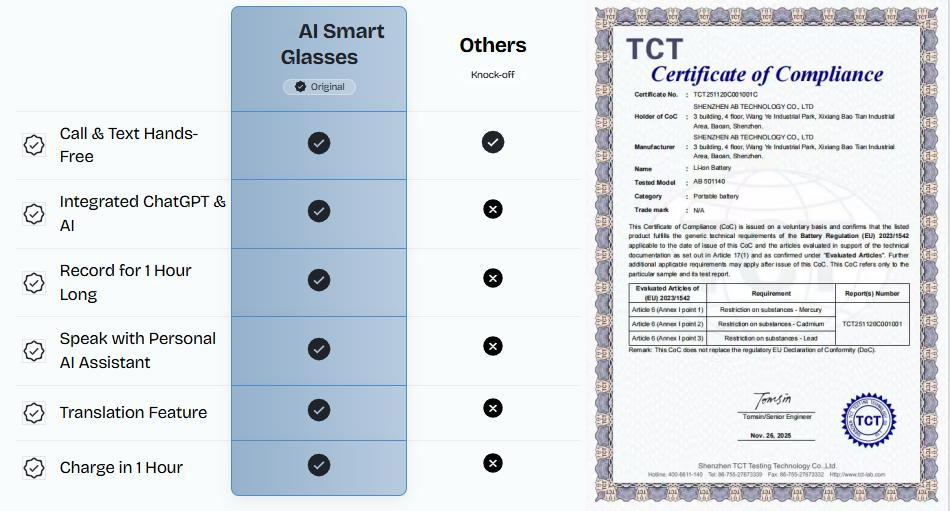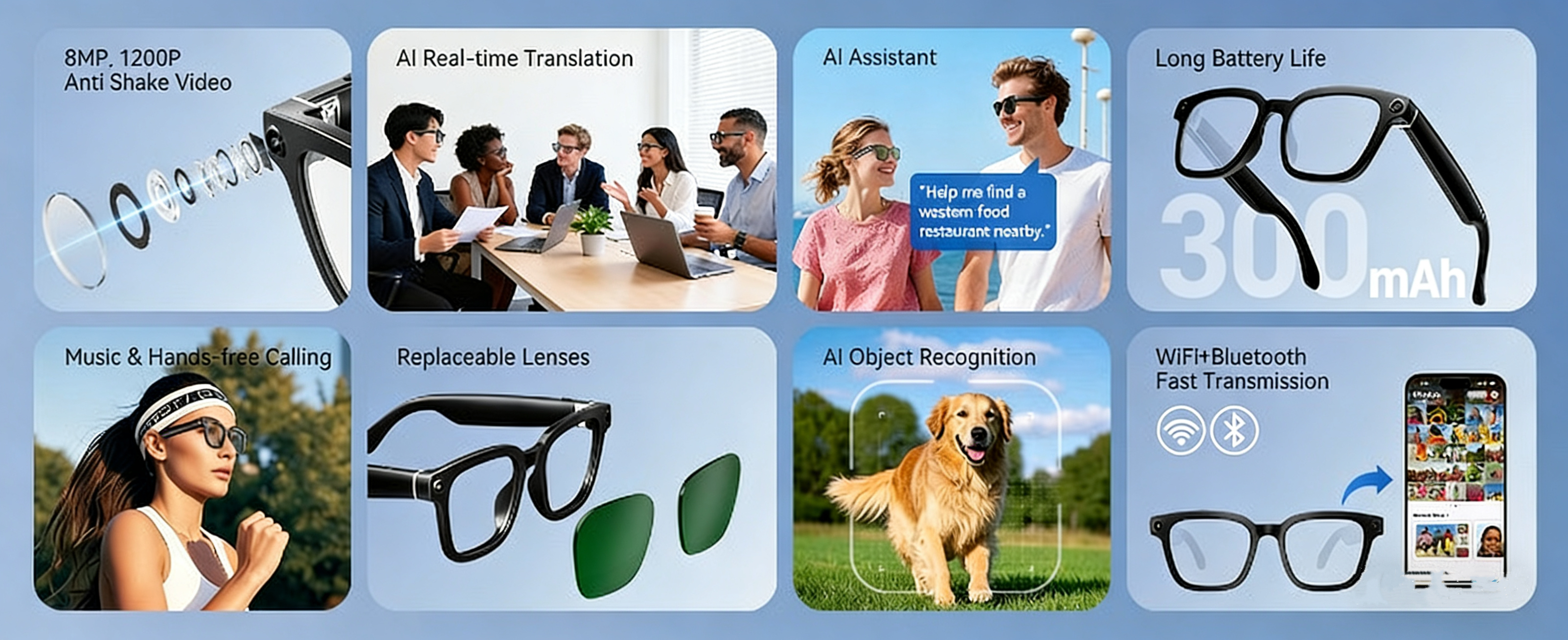 【AI Real-Time Translation & ChatGPT Assistant】AI glasses break language barriers instantly with AI real-time translation. The built-in ChatGPT voice assistant helps you communicate, learn, and handle travel or business conversations smoothly—ideal for conferences, overseas trips, and daily use.