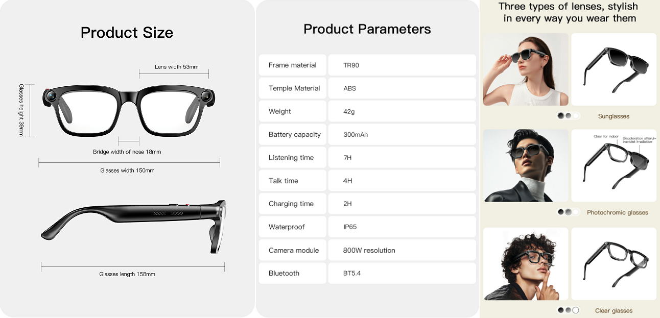 【Bluetooth Music & Hands-Free Calls 】Camera glasses provide Bluetooth music and crystal-clear hands-free calls with an open-ear design. Stay aware of your surroundings while listening—comfortable for long wear and safer for commuting, cycling, and outdoor use.