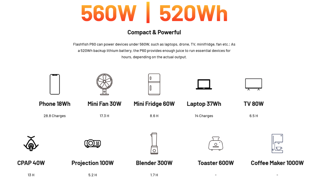 High-power 520Wh solar generator for serious outdoor adventures and emergency backup. The FlashFish P60 delivers an impressive 560W of continuous power with 1100W surge capacity, making it one of our most powerful portable power stations.