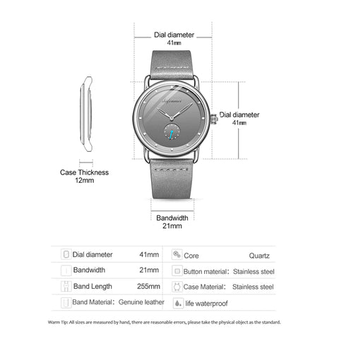 • The minimalist men's watch design with small seconds window, skeletonized hands and unique indexes also comes with a water-resistant alloy case, hard glass crystal and a large 41MM (1.61") dial.